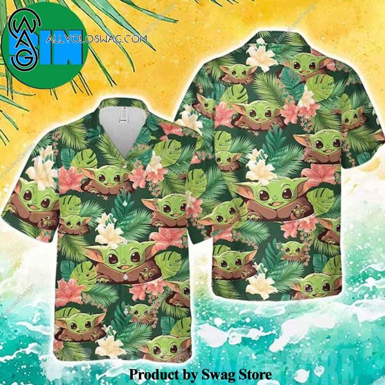 Cute Baby Yoda Star Wars Gifts Tropical Summer Vibes Hawaiian Shirt was hand-tailored in the early days of fashion. This might happen in the comfort of one’s own home or at a custom tailor’s business. These stores immediately sprang up all across the islands, especially in plantation towns and Honolulu. Newly accessible fabrics from throughout the world were sold at dry goods stores, including printed silk from Japan, raw silk, batik, and rayon from the United States mainland, and cotton cloth for kimonos and yukatas.Hawaiian history had long been shaped by Asian immigrants, and apparel designs reflected this. Short- and long-sleeved shirts, as well as women’s skirts, were created using pre-printed textiles from China and Japan and were based on Asian clothing styles. These bright blouses and dresses were the forerunners of today’s Aloha attire. On the islands, we say “ono” to describe something that is pleasantly cool.