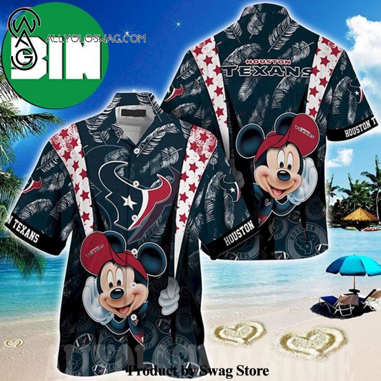 Houston Texans Mickey Mouse Disney Summer Vibes Hawaiian Shirt was hand-tailored in the early days of fashion. This might happen in the comfort of one’s own home or at a custom tailor’s business. These stores immediately sprang up all across the islands, especially in plantation towns and Honolulu. Newly accessible fabrics from throughout the world were sold at dry goods stores, including printed silk from Japan, raw silk, batik, and rayon from the United States mainland, and cotton cloth for kimonos and yukatas.Hawaiian history had long been shaped by Asian immigrants, and apparel designs reflected this. Short- and long-sleeved shirts, as well as women’s skirts, were created using pre-printed textiles from China and Japan and were based on Asian clothing styles. These bright blouses and dresses were the forerunners of today’s Aloha attire. On the islands, we say “ono” to describe something that is pleasantly cool.