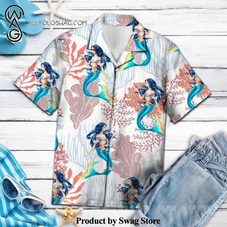Mermaid Coral Pattern For Vacation Hawaiian Shirt was hand-tailored in the early days of fashion. This might happen in the comfort of one’s own home or at a custom tailor’s business. These stores immediately sprang up all across the islands, especially in plantation towns and Honolulu. Newly accessible fabrics from throughout the world were sold at dry goods stores, including printed silk from Japan, raw silk, batik, and rayon from the United States mainland, and cotton cloth for kimonos and yukatas.Hawaiian history had long been shaped by Asian immigrants, and apparel designs reflected this. Short- and long-sleeved shirts, as well as women’s skirts, were created using pre-printed textiles from China and Japan and were based on Asian clothing styles. These bright blouses and dresses were the forerunners of today’s Aloha attire. On the islands, we say “ono” to describe something that is pleasantly cool.