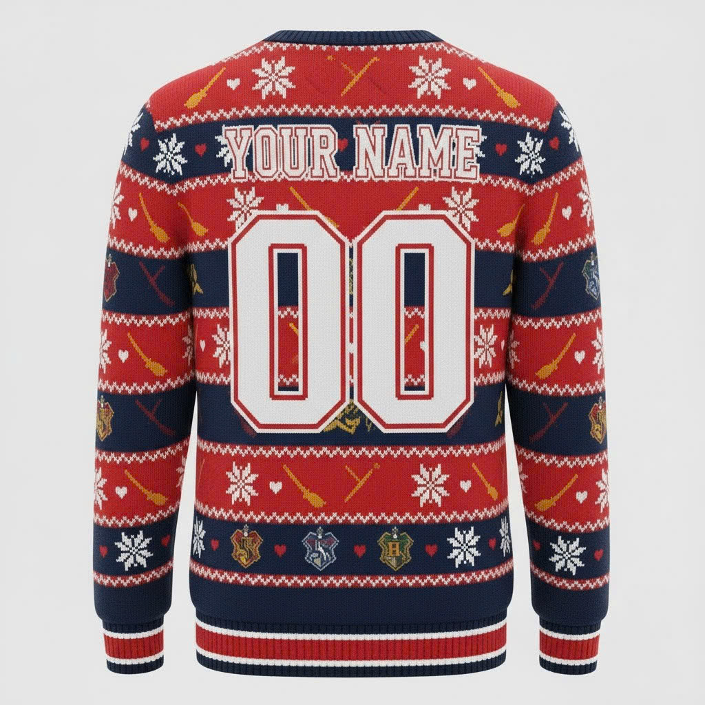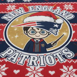 Fans will immediately recognize the color themes associated with the Patriots’ uniforms mixed with the crests of the four Hogwarts Houses (Gryffindor, Hufflepuff, Ravenclaw, and Slytherin). This mix of team pride and magical fantasy creates a sweater that feels both spirited and exciting, making it the perfect piece for holiday parties, NFL game nights, family gatherings, and fan events throughout the season.
