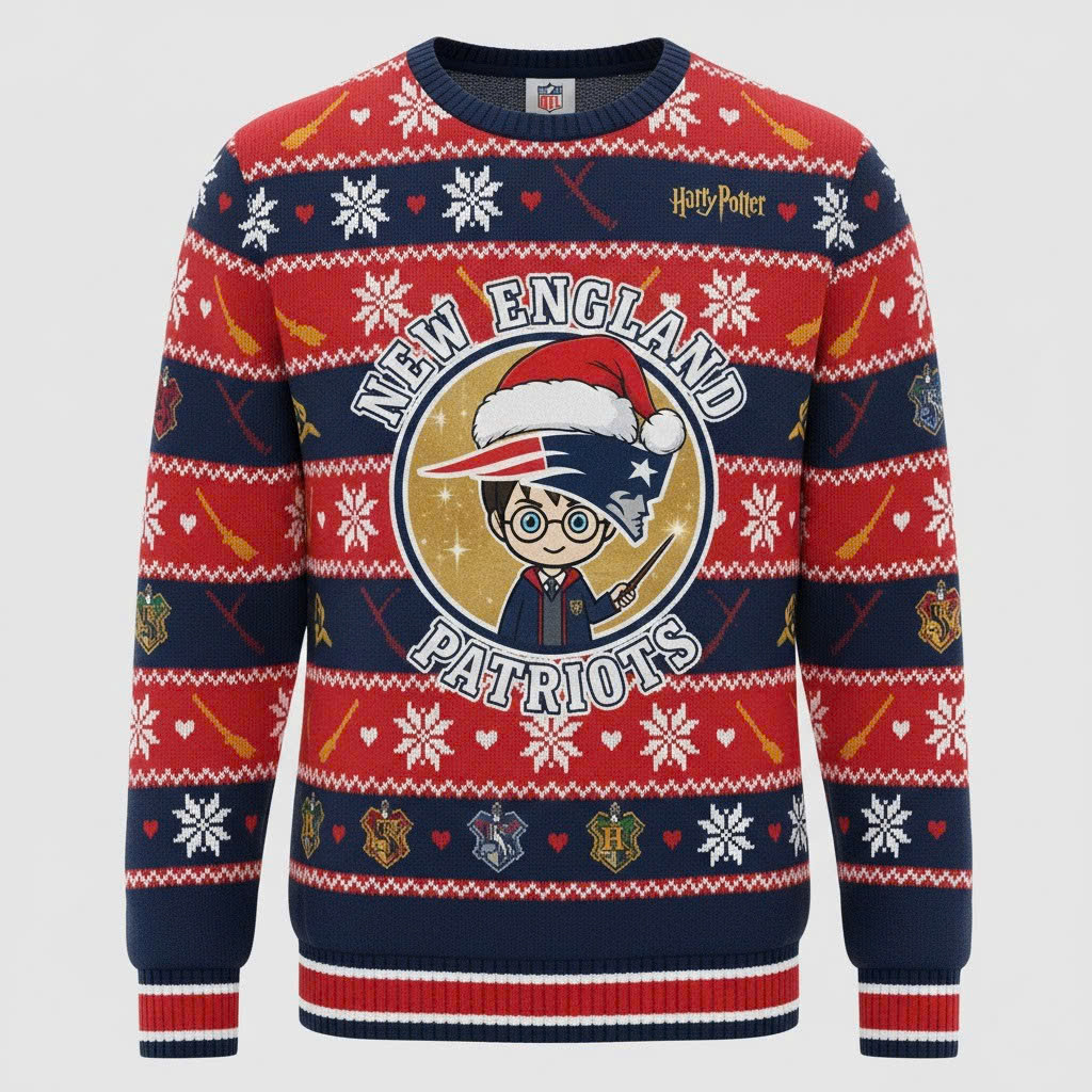 This holiday sweater is part of an exclusive crossover collection created specifically for dual fans of the New England Patriots and Harry Potter. The sweater features detailed patterns such as snowflakes, geometric winter shapes, and football-inspired graphics integrated with the magical elements. The New England Patriots wordmark is prominently displayed, with an adorable Harry Potter character casting a spell, surrounded by accents that highlight the bold personality of both brands.