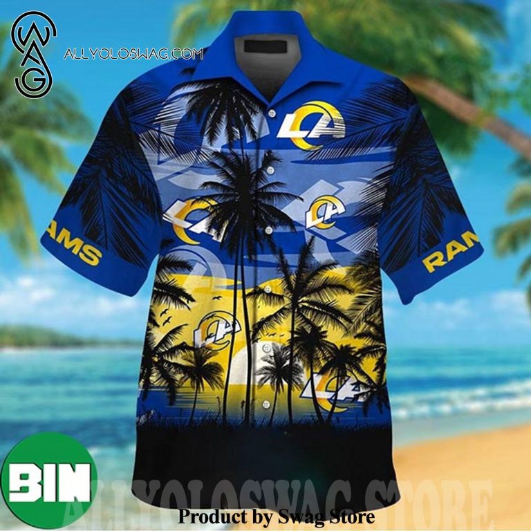 Palm Tree Blue Yellow Los Angeles Rams Hawaiian Shirt was hand-tailored in the early days of fashion. This might happen in the comfort of one’s own home or at a custom tailor’s business. These stores immediately sprang up all across the islands, especially in plantation towns and Honolulu. Newly accessible fabrics from throughout the world were sold at dry goods stores, including printed silk from Japan, raw silk, batik, and rayon from the United States mainland, and cotton cloth for kimonos and yukatas.Hawaiian history had long been shaped by Asian immigrants, and apparel designs reflected this. Short- and long-sleeved shirts, as well as women’s skirts, were created using pre-printed textiles from China and Japan and were based on Asian clothing styles. These bright blouses and dresses were the forerunners of today’s Aloha attire. On the islands, we say “ono” to describe something that is pleasantly cool.