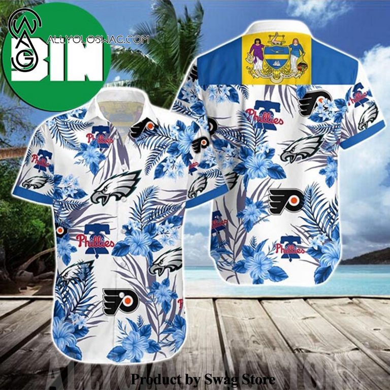 Philadelphia Eagles Phillies Flyers Summer Tropical Hawaiian Shirt was hand-tailored in the early days of fashion. This might happen in the comfort of one’s own home or at a custom tailor’s business. These stores immediately sprang up all across the islands, especially in plantation towns and Honolulu. Newly accessible fabrics from throughout the world were sold at dry goods stores, including printed silk from Japan, raw silk, batik, and rayon from the United States mainland, and cotton cloth for kimonos and yukatas.Hawaiian history had long been shaped by Asian immigrants, and apparel designs reflected this. Short- and long-sleeved shirts, as well as women’s skirts, were created using pre-printed textiles from China and Japan and were based on Asian clothing styles. These bright blouses and dresses were the forerunners of today’s Aloha attire. On the islands, we say “ono” to describe something that is pleasantly cool.