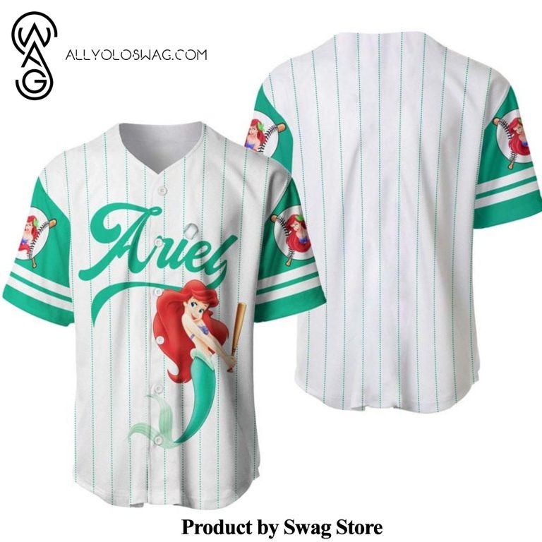 9 Effortlessly Cool Baseball Jersey Outfit Ideas [Top-selling] Ariel Princess The Little Mermaid All Over Print Pinstripe Baseball Jersey – White
