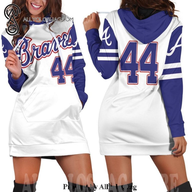 Three Outfit Ideas For A Hoodie Dress [Top-selling] Atlanta Braves Hank Aaron 44 MLB White And Blue New Style Full Print Hoodie Dress