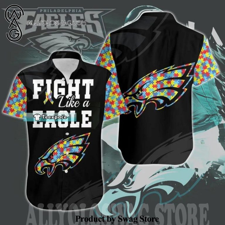 [Top-selling] Autism Support Fight Like A Eagle Summer Set Hawaiian Shirt was hand-tailored in the early days of fashion. This might happen in the comfort of one’s own home or at a custom tailor’s business. These stores immediately sprang up all across the islands, especially in plantation towns and Honolulu. Newly accessible fabrics from throughout the world were sold at dry goods stores, including printed silk from Japan, raw silk, batik, and rayon from the United States mainland, and cotton cloth for kimonos and yukatas.Hawaiian history had long been shaped by Asian immigrants, and apparel designs reflected this. Short- and long-sleeved shirts, as well as women’s skirts, were created using pre-printed textiles from China and Japan and were based on Asian clothing styles. These bright blouses and dresses were the forerunners of today’s Aloha attire. On the islands, we say “ono” to describe something that is pleasantly cool.