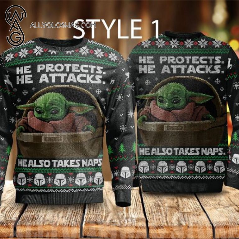 [Top-selling] Baby Yoda He Protects He Attacks He Also Takes Naps Ugly Christmas Sweater