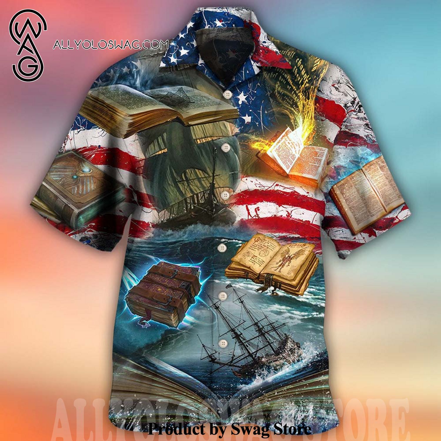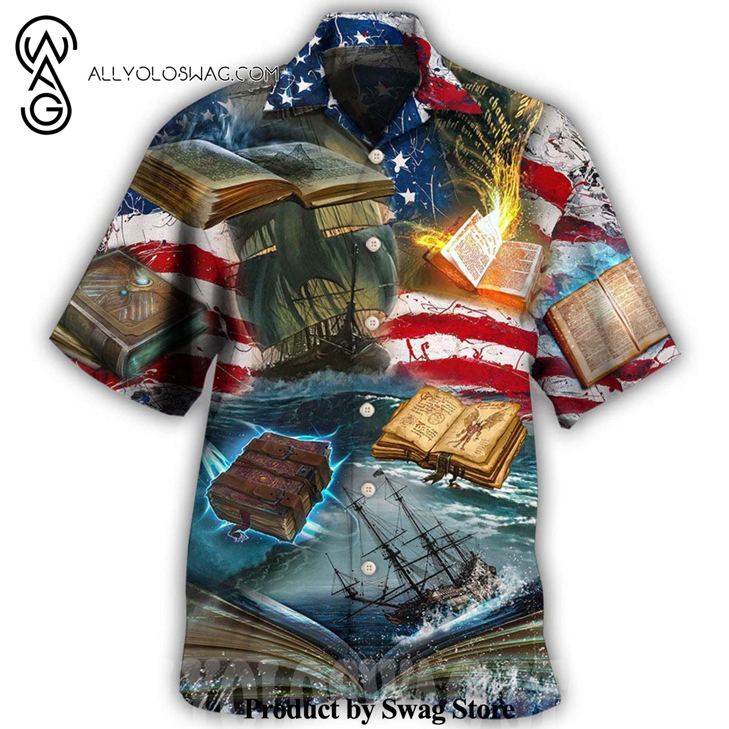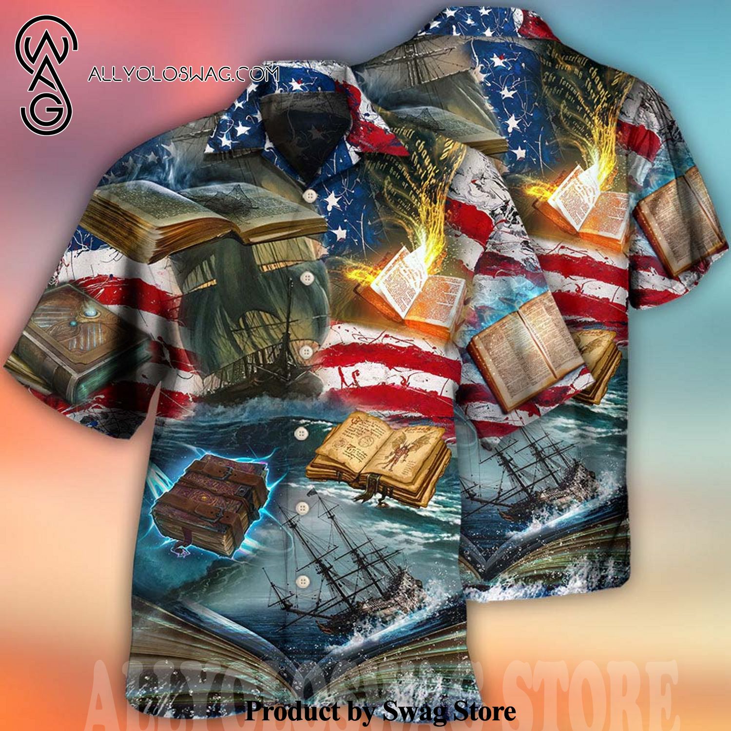 [Top-selling] Book Independence Day High Fashion Full Printing Hawaiian Shirt was hand-tailored in the early days of fashion. This might happen in the comfort of one’s own home or at a custom tailor’s business. These stores immediately sprang up all across the islands, especially in plantation towns and Honolulu. Newly accessible fabrics from throughout the world were sold at dry goods stores, including printed silk from Japan, raw silk, batik, and rayon from the United States mainland, and cotton cloth for kimonos and yukatas.Hawaiian history had long been shaped by Asian immigrants, and apparel designs reflected this. Short- and long-sleeved shirts, as well as women’s skirts, were created using pre-printed textiles from China and Japan and were based on Asian clothing styles. These bright blouses and dresses were the forerunners of today’s Aloha attire. On the islands, we say “ono” to describe something that is pleasantly cool.