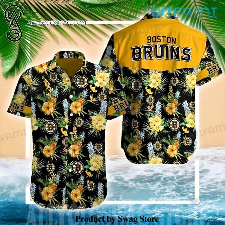 [Top-selling] Bruins Pineapple Tropical Flower Boston Bruins Gift Hawaiian Shirt was hand-tailored in the early days of fashion. This might happen in the comfort of one’s own home or at a custom tailor’s business. These stores immediately sprang up all across the islands, especially in plantation towns and Honolulu. Newly accessible fabrics from throughout the world were sold at dry goods stores, including printed silk from Japan, raw silk, batik, and rayon from the United States mainland, and cotton cloth for kimonos and yukatas.Hawaiian history had long been shaped by Asian immigrants, and apparel designs reflected this. Short- and long-sleeved shirts, as well as women’s skirts, were created using pre-printed textiles from China and Japan and were based on Asian clothing styles. These bright blouses and dresses were the forerunners of today’s Aloha attire. On the islands, we say “ono” to describe something that is pleasantly cool.