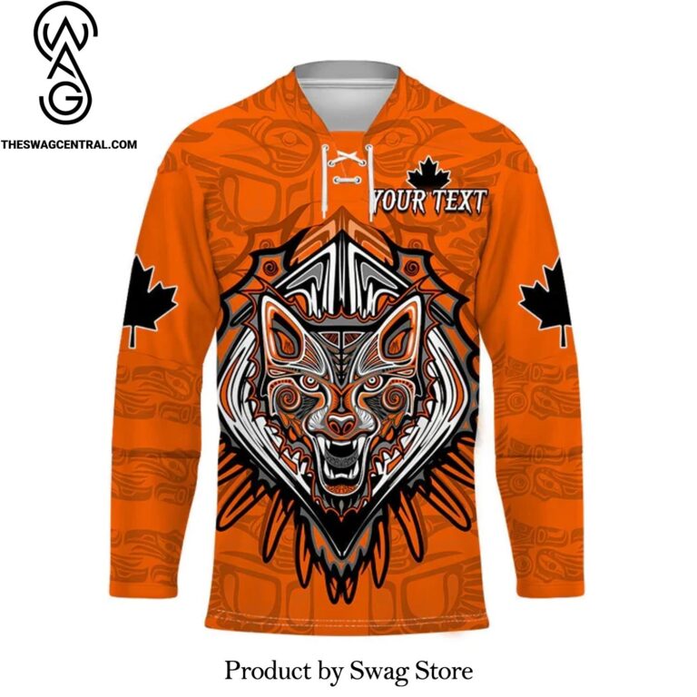 NOTE: [Top-selling] Canada Maple Leaf Orange Haida Wolf Pattern All Over Print Custom Patch Jersey