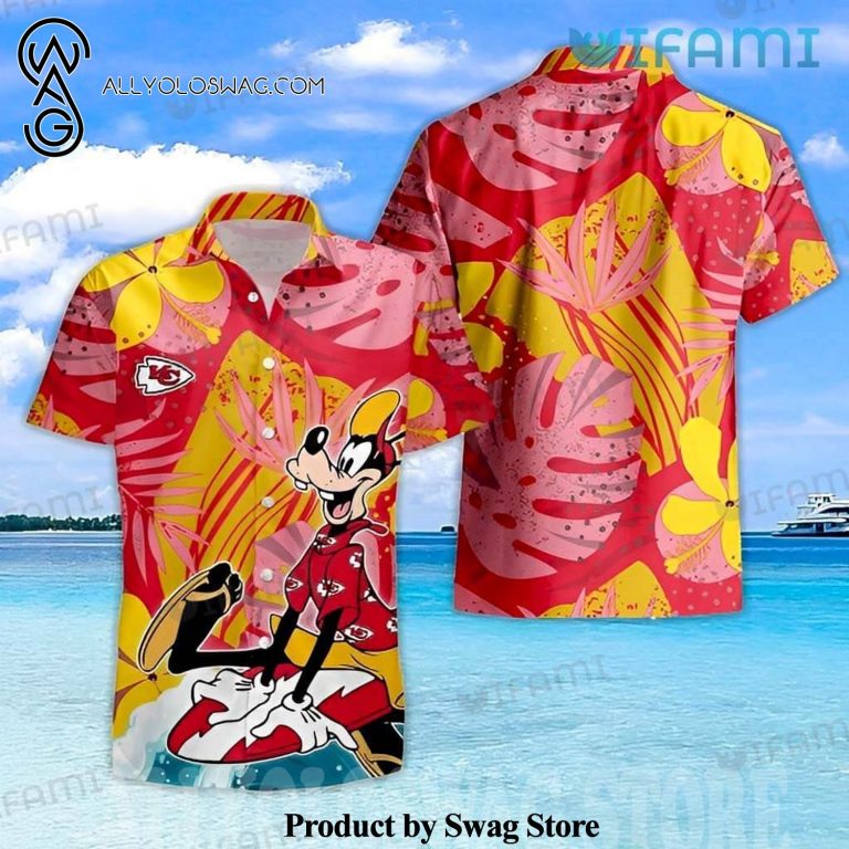 [Top-selling] Chiefs Goofy Surfing Palm Leaf Kansas City Gift Hawaiian Shirt was hand-tailored in the early days of fashion. This might happen in the comfort of one’s own home or at a custom tailor’s business. These stores immediately sprang up all across the islands, especially in plantation towns and Honolulu. Newly accessible fabrics from throughout the world were sold at dry goods stores, including printed silk from Japan, raw silk, batik, and rayon from the United States mainland, and cotton cloth for kimonos and yukatas.Hawaiian history had long been shaped by Asian immigrants, and apparel designs reflected this. Short- and long-sleeved shirts, as well as women’s skirts, were created using pre-printed textiles from China and Japan and were based on Asian clothing styles. These bright blouses and dresses were the forerunners of today’s Aloha attire. On the islands, we say “ono” to describe something that is pleasantly cool.