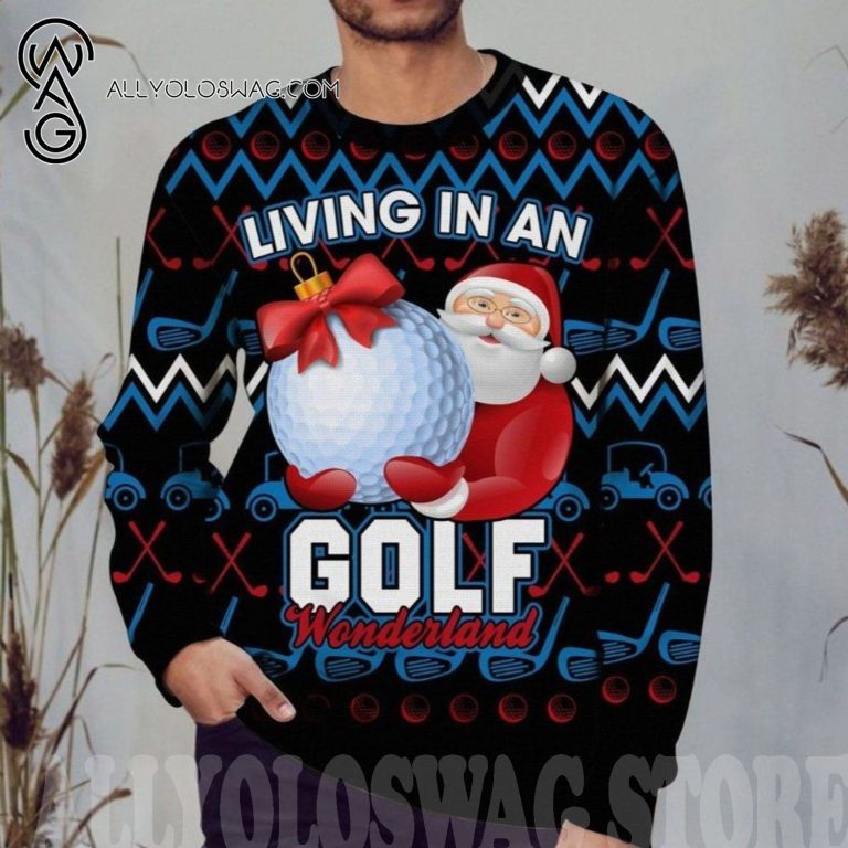 NOTE: [Top-selling] Christmas Living In A Golf Wonderland Santa Claus Knitting Pattern Ugly Christmas Sweater