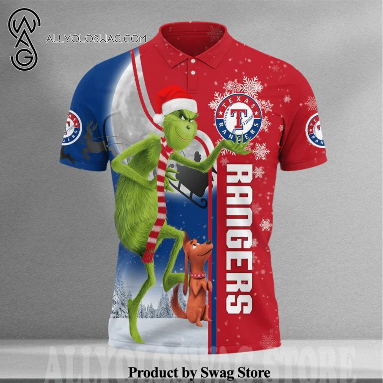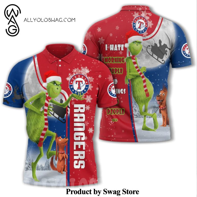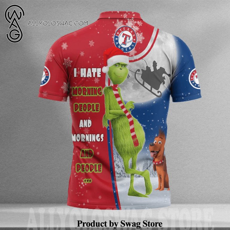 The origins of the [Top-selling] Christmas The Grinch Texas Rangers I Hate Morning People All Over Printed Polo Shirt can be traced back to the early 20th century when it was primarily worn by polo players. Its design was inspired by the need for a practical yet stylish garment that allowed for ease of movement during the fast-paced game. The polo shirt features a soft collar, a buttoned placket at the neck, and a relaxed fit that allows for comfortable and unrestricted movement.
