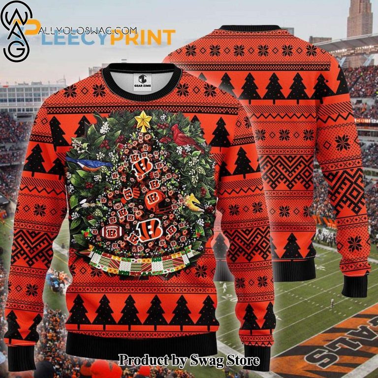 Some details about our [Top-selling] Cincinnati Bengals Christmas Football Pine Tree Shape Ugly Christmas Sweater