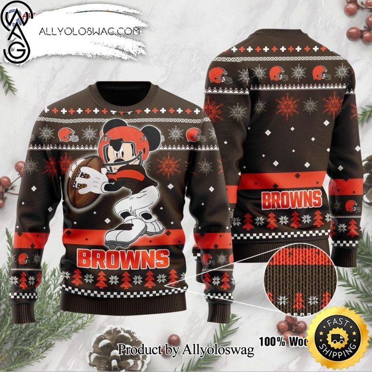 Some details about our [Top-selling] Cleveland Browns Mickey Mouse The Decisive Throw Ugly Christmas Holiday Sweater