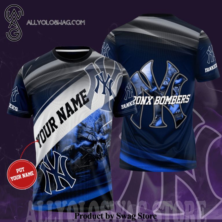 Product description information [Top-selling] Custom New York Yankees Bronx Bombers Smoky Blue Skull Full Printing Casual Unisex T-Shirt – Black