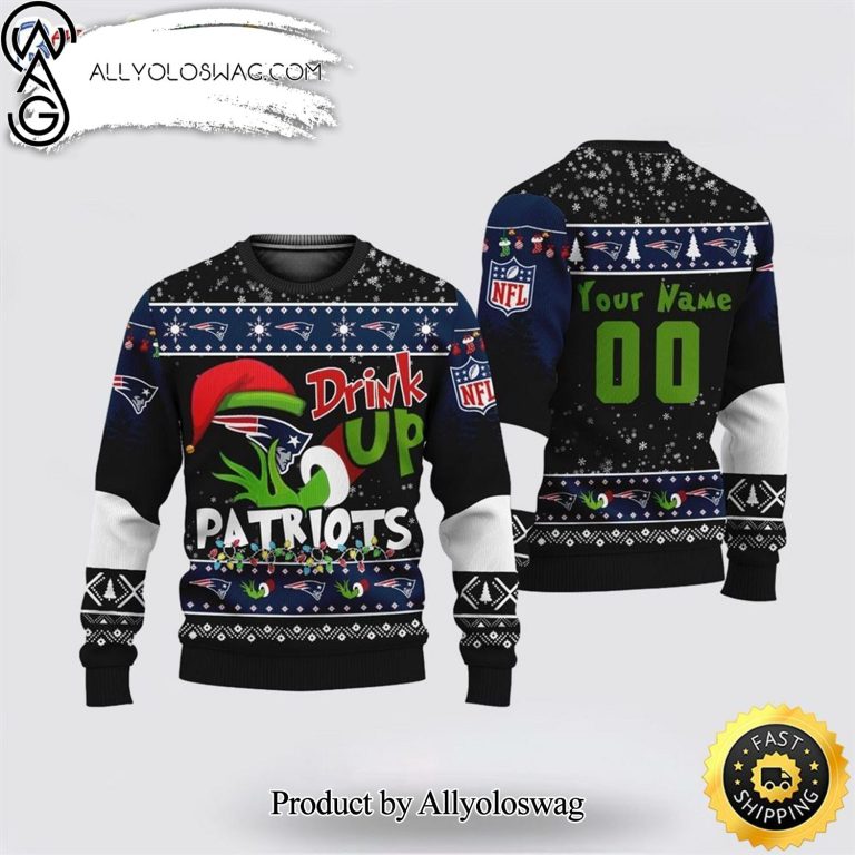 NOTE: [Top-selling] Custom NFL New England Patriots Grinch Drink Up Christmas Gift For Football Fans Knitting Pattern Ugly Christmas Sweater