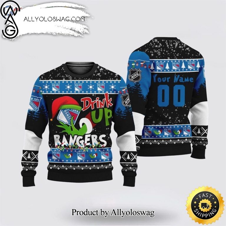 NOTE: [Top-selling] Custom NHL New York Rangers Grinch Drink Up Christmas Gift For Football Fans Knitting Pattern Ugly Christmas Sweater
