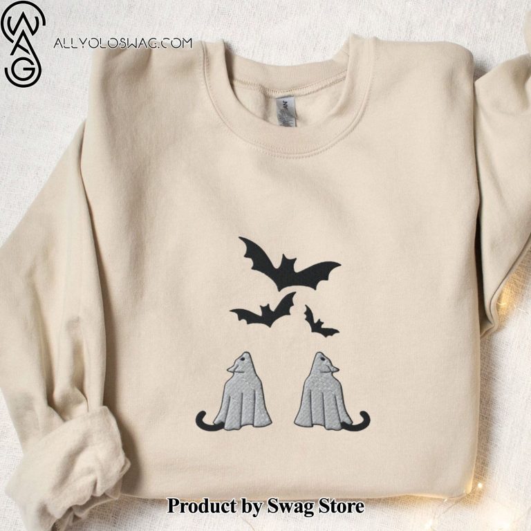 NOTE: [Top-selling] Embroidered Cat Halloween Sweatshirt, Cute Black Cats in Ghost Costume C