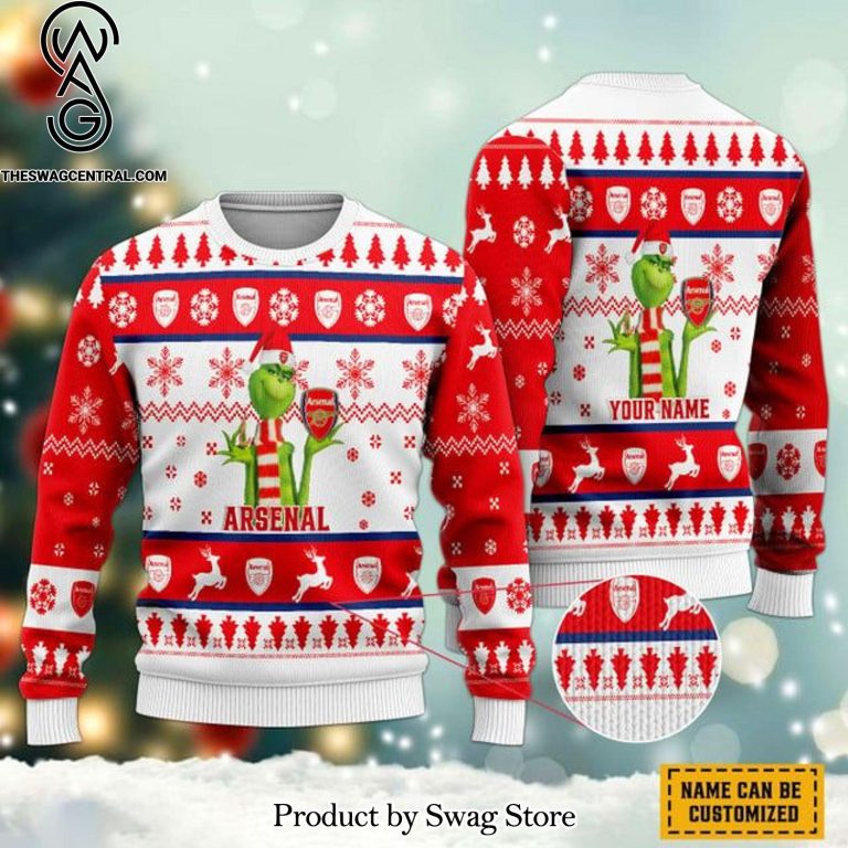 NOTE: [Top-selling] English Premier League Arsenal Grinch Custom Name Ugly Xmas Wool Knitted Sweater