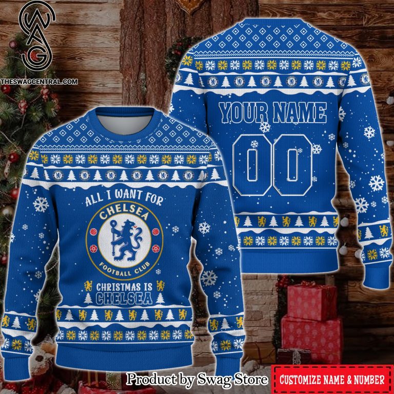 NOTE: [Top-selling] English Premier League Chelsea All I Want For Christmas Custom Name And Number For Christmas Gifts Ugly Xmas Wool Knitted Sweater