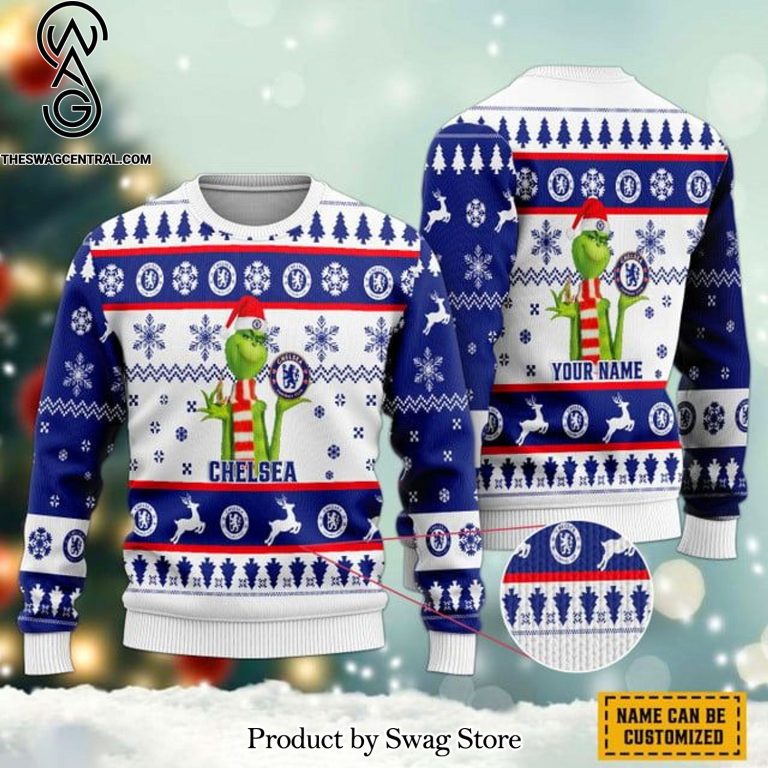 [Top-selling] English Premier League Chelsea Grinch Custom Name For Christmas Gifts Christmas Ugly Wool Knitted Sweater