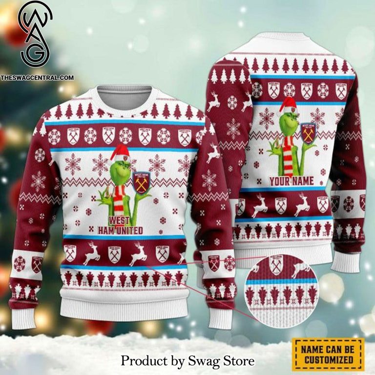 NOTE: [Top-selling] English Premier League West Ham United Grinch Custom Name Ugly Christmas Wool Knitted Sweater
