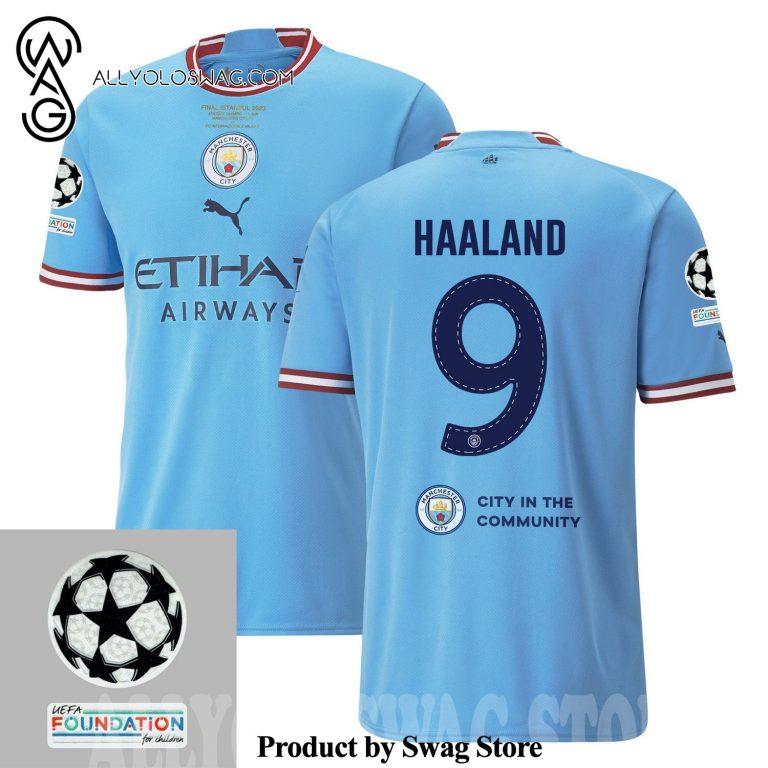 Some details about our product [Top-selling] Erling Haaland 9 Manchester City UEFA 2023 Final Match Details Patch Badge – Home 3D Unisex Jersey