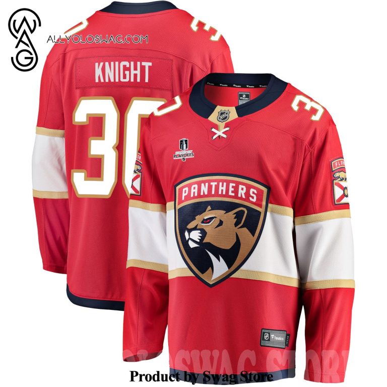 NOTE: [Top-selling] Florida Panthers Spencer Knight 30 Home 2023 Stanley Cup Playoffs Breakaway Men – Red