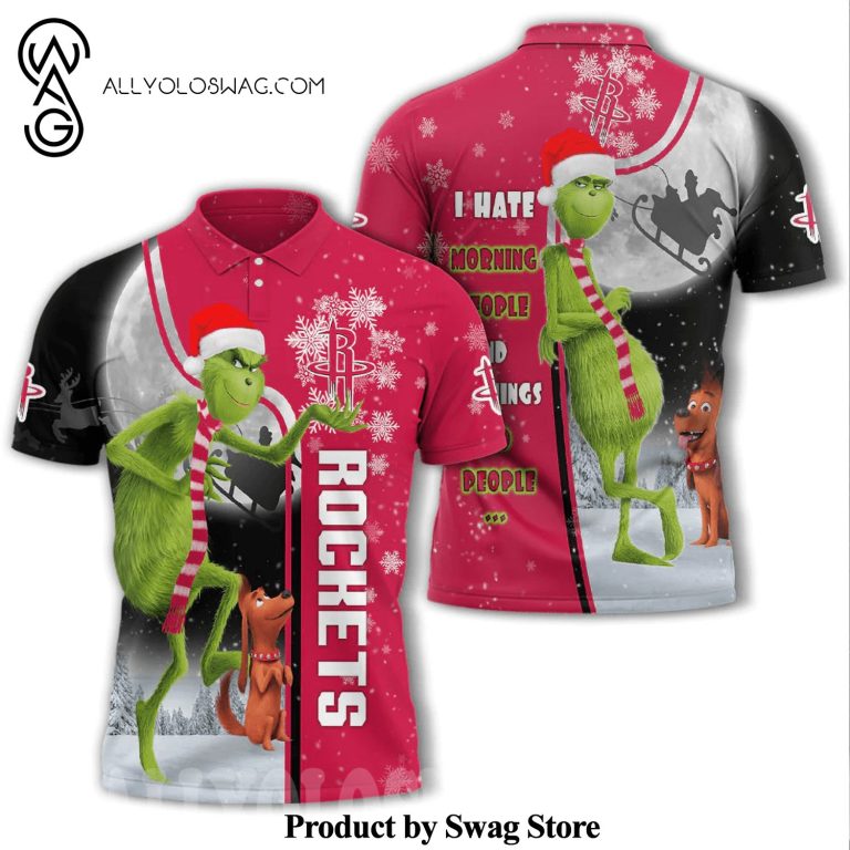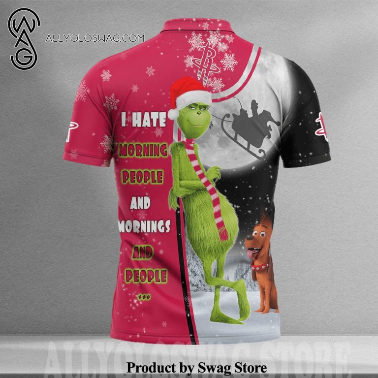 The origins of the [Top-selling] Funny Christmas The Grinch Houston Rockets I Hate Morning People Full Printed Polo Shirt can be traced back to the early 20th century when it was primarily worn by polo players. Its design was inspired by the need for a practical yet stylish garment that allowed for ease of movement during the fast-paced game. The polo shirt features a soft collar, a buttoned placket at the neck, and a relaxed fit that allows for comfortable and unrestricted movement.