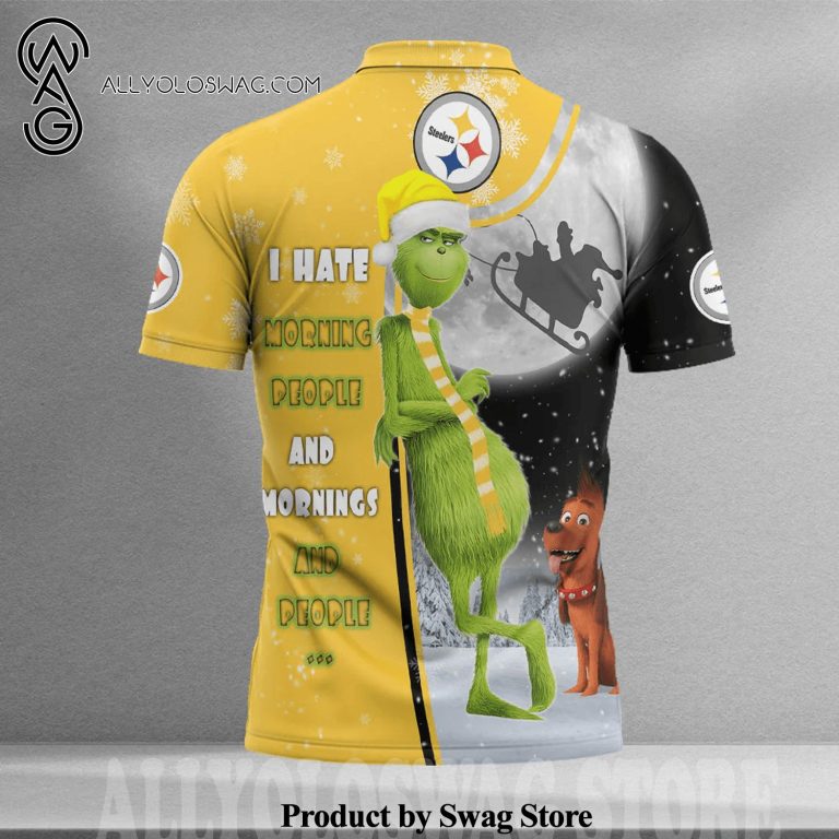 The origins of the [Top-selling] Funny Christmas The Grinch Pittsburgh Steelers I Hate Morning People All Over Printed Polo Shirt can be traced back to the early 20th century when it was primarily worn by polo players. Its design was inspired by the need for a practical yet stylish garment that allowed for ease of movement during the fast-paced game. The polo shirt features a soft collar, a buttoned placket at the neck, and a relaxed fit that allows for comfortable and unrestricted movement.