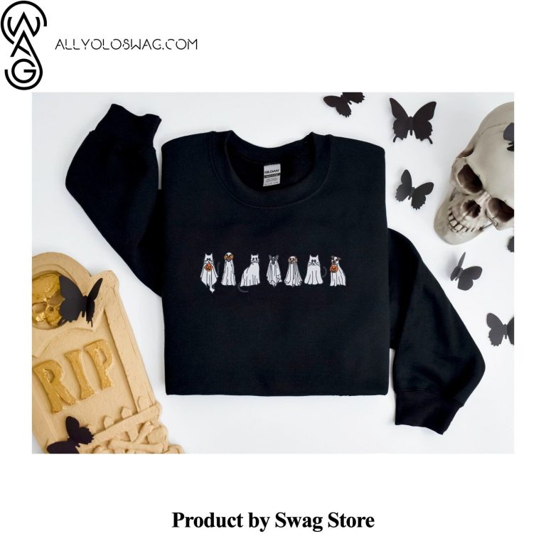 NOTE: [Top-selling] Ghost Dog and Cats Halloween Embroidery, Halloween Ghost Dog and Cats Embroidered Sweatshirt, Pumpkin Sweatshirt
