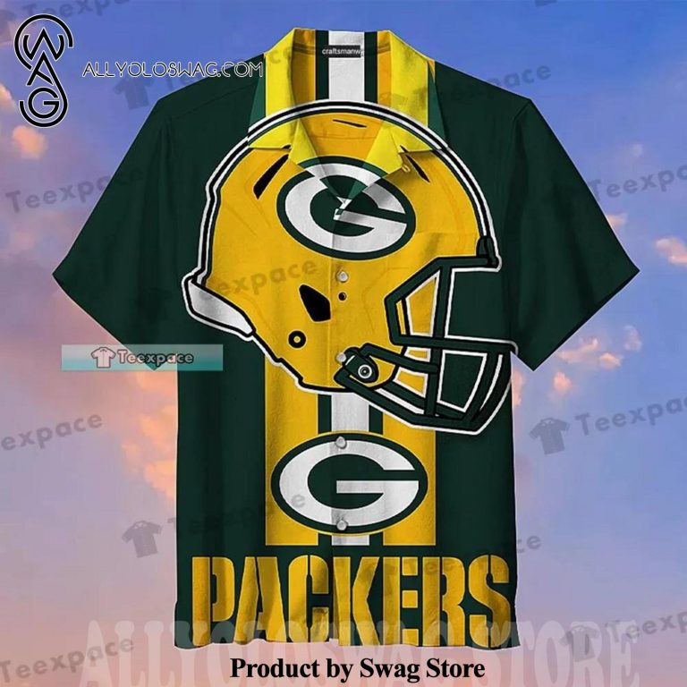 [Top-selling] Green Bay Packers Helmet Summer Set Hawaiian Shirt was hand-tailored in the early days of fashion. This might happen in the comfort of one’s own home or at a custom tailor’s business. These stores immediately sprang up all across the islands, especially in plantation towns and Honolulu. Newly accessible fabrics from throughout the world were sold at dry goods stores, including printed silk from Japan, raw silk, batik, and rayon from the United States mainland, and cotton cloth for kimonos and yukatas.Hawaiian history had long been shaped by Asian immigrants, and apparel designs reflected this. Short- and long-sleeved shirts, as well as women’s skirts, were created using pre-printed textiles from China and Japan and were based on Asian clothing styles. These bright blouses and dresses were the forerunners of today’s Aloha attire. On the islands, we say “ono” to describe something that is pleasantly cool.