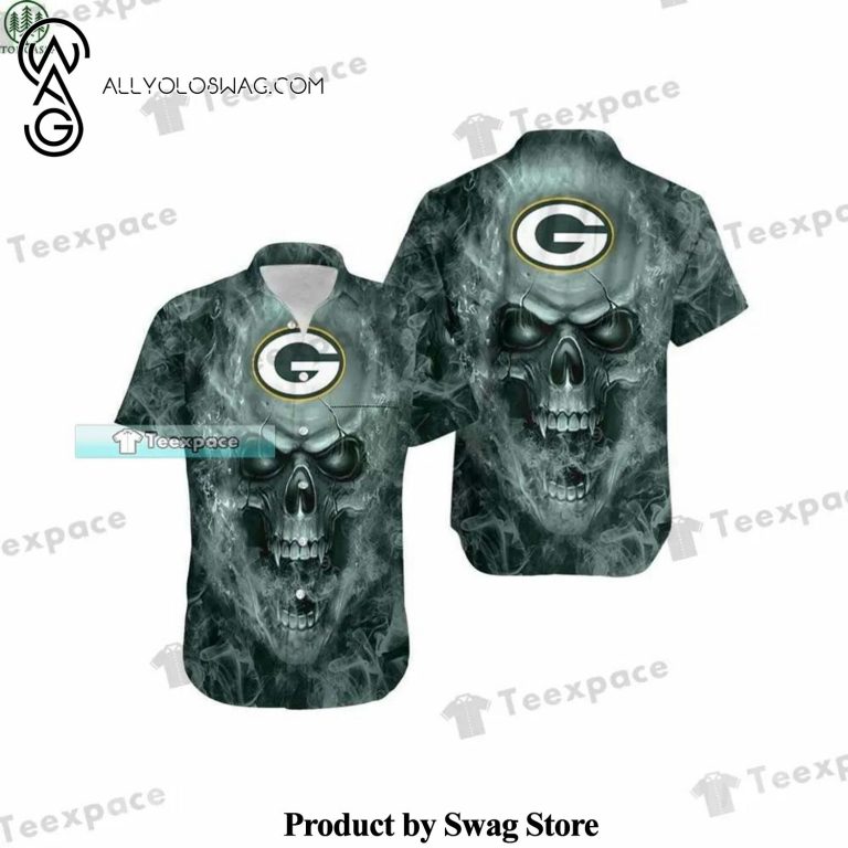 [Top-selling] Green Bay Packers Smoky Skull Summer Set Hawaiian Shirt was hand-tailored in the early days of fashion. This might happen in the comfort of one’s own home or at a custom tailor’s business. These stores immediately sprang up all across the islands, especially in plantation towns and Honolulu. Newly accessible fabrics from throughout the world were sold at dry goods stores, including printed silk from Japan, raw silk, batik, and rayon from the United States mainland, and cotton cloth for kimonos and yukatas.Hawaiian history had long been shaped by Asian immigrants, and apparel designs reflected this. Short- and long-sleeved shirts, as well as women’s skirts, were created using pre-printed textiles from China and Japan and were based on Asian clothing styles. These bright blouses and dresses were the forerunners of today’s Aloha attire. On the islands, we say “ono” to describe something that is pleasantly cool.