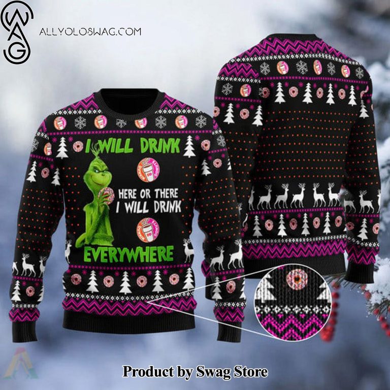 Some details about our [Top-selling] Grinch I Will Drink Dunkin Donuts Everywhere Ugly Christmas Wool Knitted Sweater