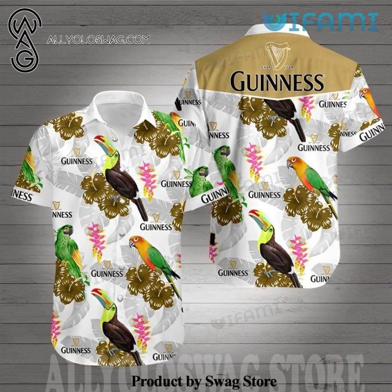 [Top-selling] Guinness Parrot Hibiscus Guinness Beer Gift Hawaiian Shirt was hand-tailored in the early days of fashion. This might happen in the comfort of one’s own home or at a custom tailor’s business. These stores immediately sprang up all across the islands, especially in plantation towns and Honolulu. Newly accessible fabrics from throughout the world were sold at dry goods stores, including printed silk from Japan, raw silk, batik, and rayon from the United States mainland, and cotton cloth for kimonos and yukatas.Hawaiian history had long been shaped by Asian immigrants, and apparel designs reflected this. Short- and long-sleeved shirts, as well as women’s skirts, were created using pre-printed textiles from China and Japan and were based on Asian clothing styles. These bright blouses and dresses were the forerunners of today’s Aloha attire. On the islands, we say “ono” to describe something that is pleasantly cool.