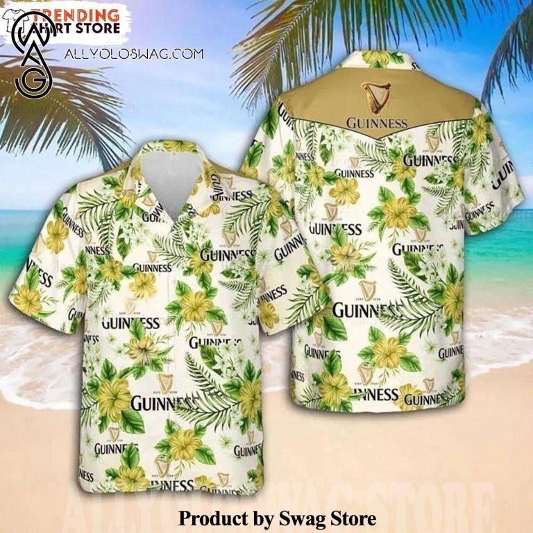 [Top-selling] Guinness Summer Set Hawaiian Shirt Bright Yellow And Green Flora was hand-tailored in the early days of fashion. This might happen in the comfort of one’s own home or at a custom tailor’s business. These stores immediately sprang up all across the islands, especially in plantation towns and Honolulu. Newly accessible fabrics from throughout the world were sold at dry goods stores, including printed silk from Japan, raw silk, batik, and rayon from the United States mainland, and cotton cloth for kimonos and yukatas.Hawaiian history had long been shaped by Asian immigrants, and apparel designs reflected this. Short- and long-sleeved shirts, as well as women’s skirts, were created using pre-printed textiles from China and Japan and were based on Asian clothing styles. These bright blouses and dresses were the forerunners of today’s Aloha attire. On the islands, we say “ono” to describe something that is pleasantly cool.
