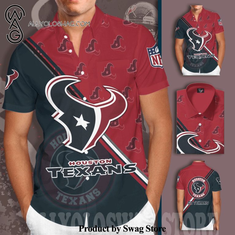 Some details about our product [Top-selling] Houston Texans Logo Go Texans All Over Print Short Sleeve Dress Shirt Hawaiian Summer Aloha Beach Shirt – Black Red