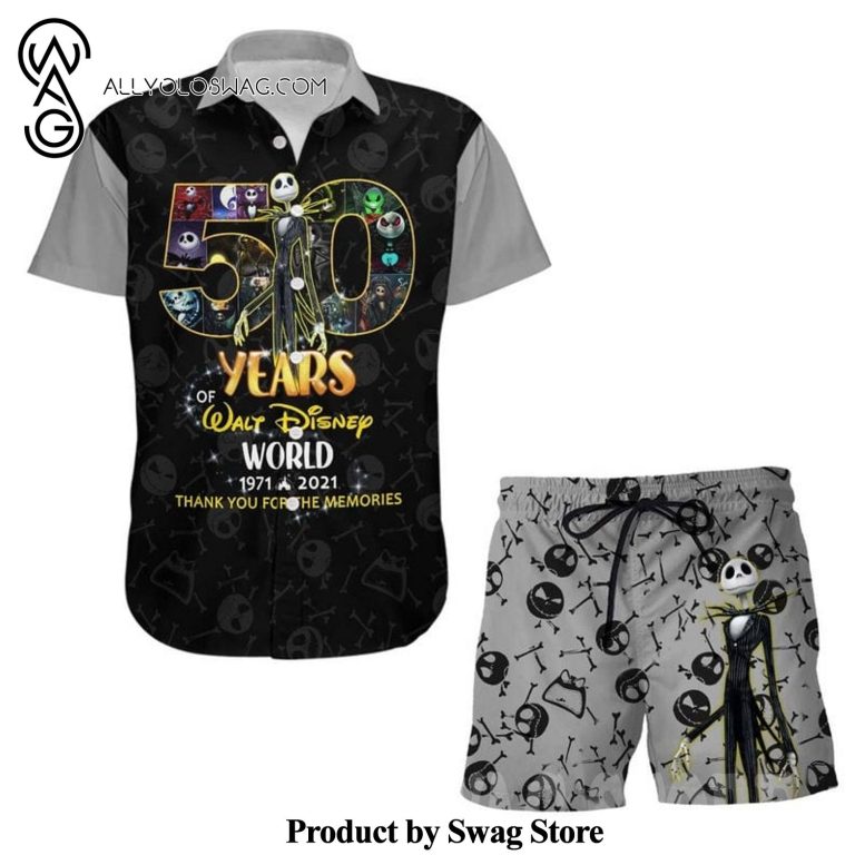 Some details about our product [Top-selling] Jack Skellington 50th Anniversary Glitter Disney Castle All Over Print Combo Hawaiian Shirt And Beach Shorts – Black Gray