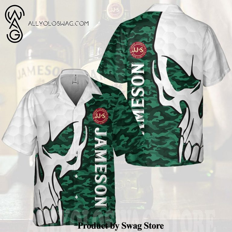 Hawaiian Shirt [Top-selling] Jameson Irish Whiskey Skull Pattern All Over Print Camo Aloha Summer Beach Hawaiian Shirt – White Green