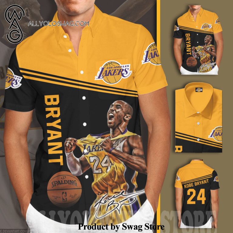 Some details about our product [Top-selling] Kobe Bryant 24 Signature Los Angeles Lakers All Over Print Short Sleeve Dress Shirt Hawaiian Summer Aloha Beach Shirt – Black Yellow