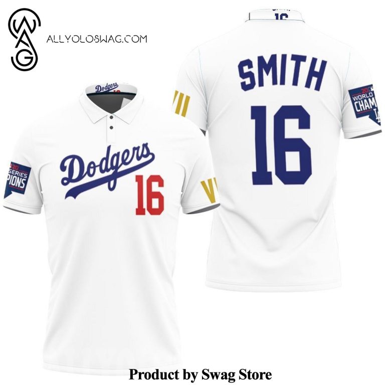 The origins of the [Top-selling] Los Angeles Dodgers Smith 16 Championship Golden Edition White Jersey Inspired Style Full Printed Polo Shirt can be traced back to the early 20th century when it was primarily worn by polo players. Its design was inspired by the need for a practical yet stylish garment that allowed for ease of movement during the fast-paced game. The polo shirt features a soft collar, a buttoned placket at the neck, and a relaxed fit that allows for comfortable and unrestricted movement.