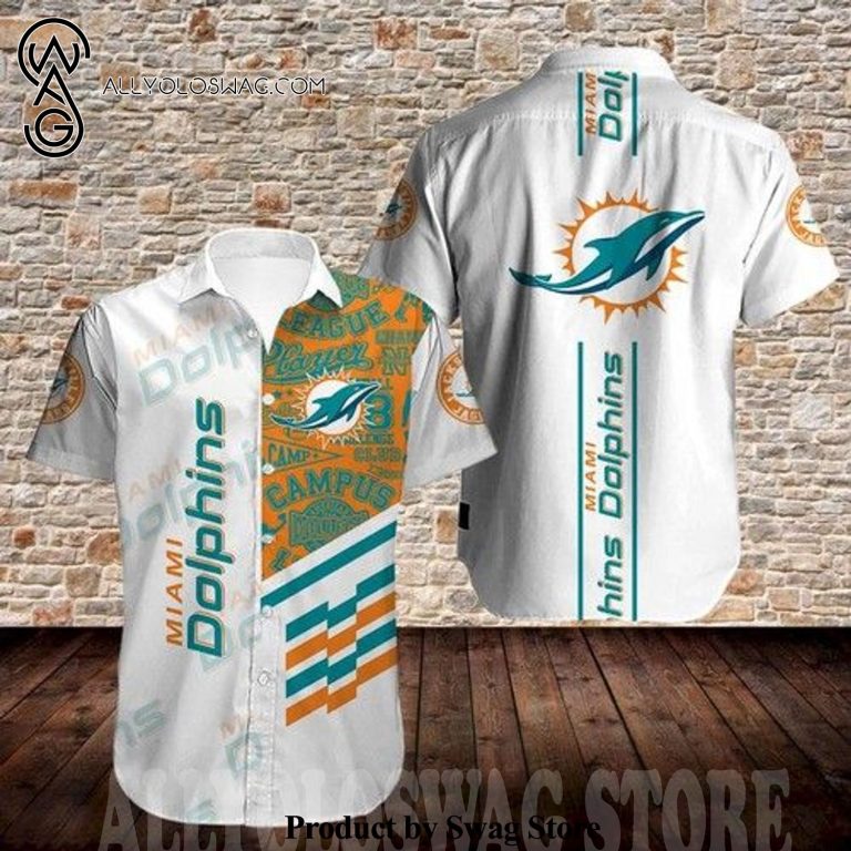 [Top-selling] Miami Dolphins New Version Hawaiian Shirt was hand-tailored in the early days of fashion. This might happen in the comfort of one’s own home or at a custom tailor’s business. These stores immediately sprang up all across the islands, especially in plantation towns and Honolulu. Newly accessible fabrics from throughout the world were sold at dry goods stores, including printed silk from Japan, raw silk, batik, and rayon from the United States mainland, and cotton cloth for kimonos and yukatas.Hawaiian history had long been shaped by Asian immigrants, and apparel designs reflected this. Short- and long-sleeved shirts, as well as women’s skirts, were created using pre-printed textiles from China and Japan and were based on Asian clothing styles. These bright blouses and dresses were the forerunners of today’s Aloha attire. On the islands, we say “ono” to describe something that is pleasantly cool.