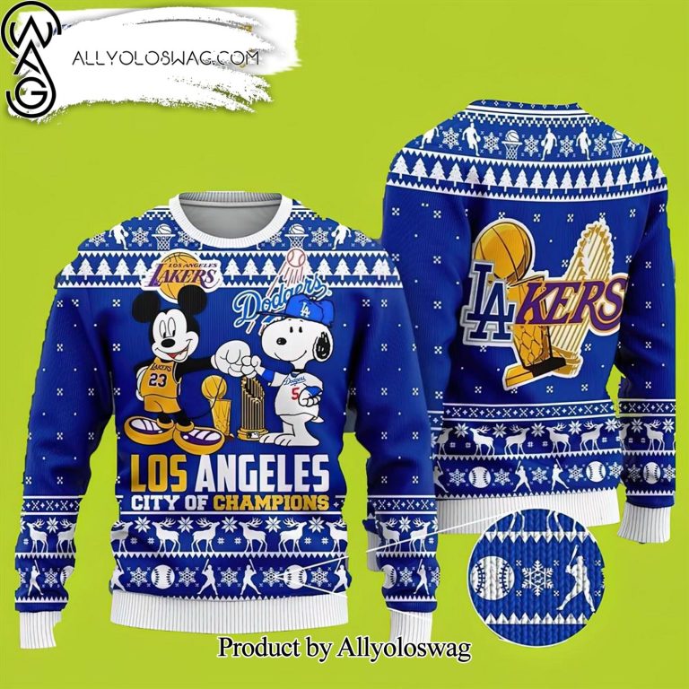 Some details about our [Top-selling] Mickey Mouse Los Angeles Lakers And Snoopy Lakers Ugly Christmas Holiday Sweater