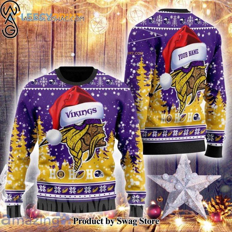 Some details about our [Top-selling] Minnesota Vikings Symbol Wearing Santa Claus Hat Ho Ho Ho Ugly Christmas Sweater