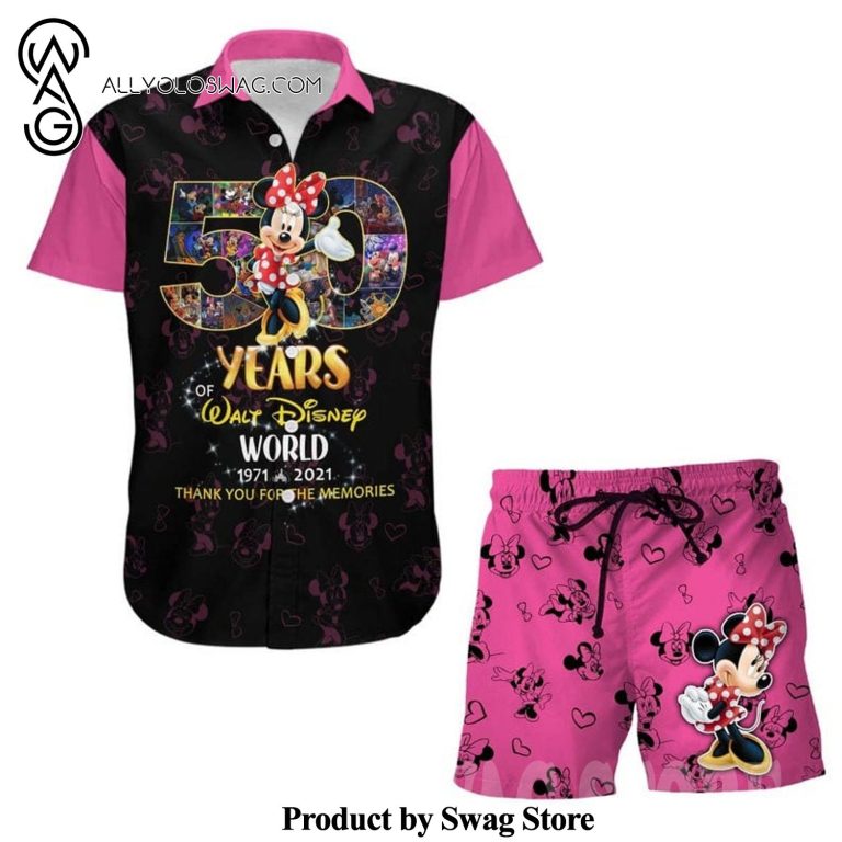 Some details about our product [Top-selling] Minnie Mouse 50th Anniversary Glitter Disney Castle All Over Print Combo Hawaiian Shirt And Beach Shorts – Black Pink