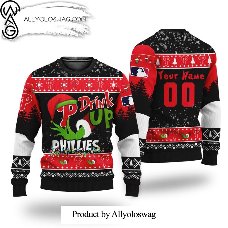 NOTE: [Top-selling] MLB Grinch Drink Up Philadelphia Phillies Customs Knitting Pattern Ugly Christmas Holiday Sweater