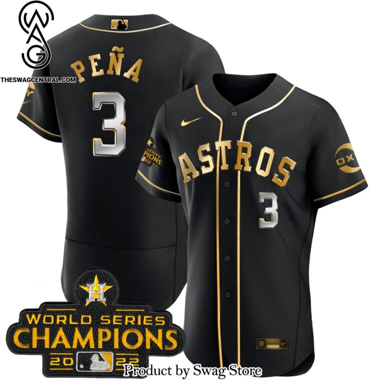 NOTE: [Top-selling] MLB Houston Astros 2022 Champions Black Gold Rush Flex Base New Style Full Print Custom Patch Jersey