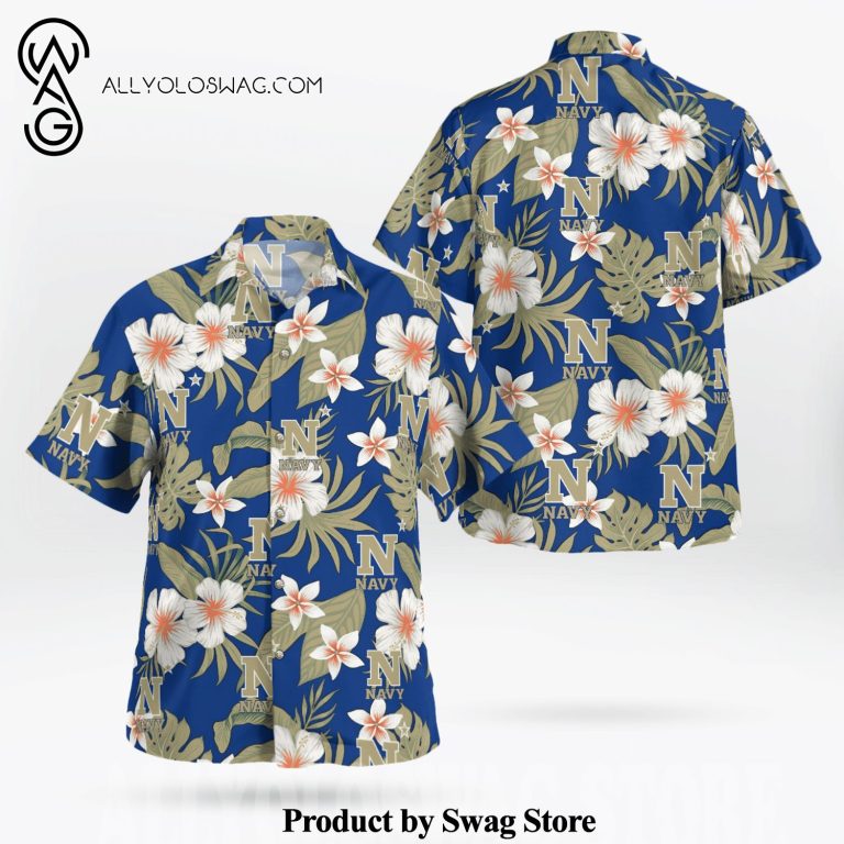 Some details about our product [Top-selling] Navy Midshipmen Logo All Over Print Flowery Aloha Summer Beach Hawaiian Shirt – Navy