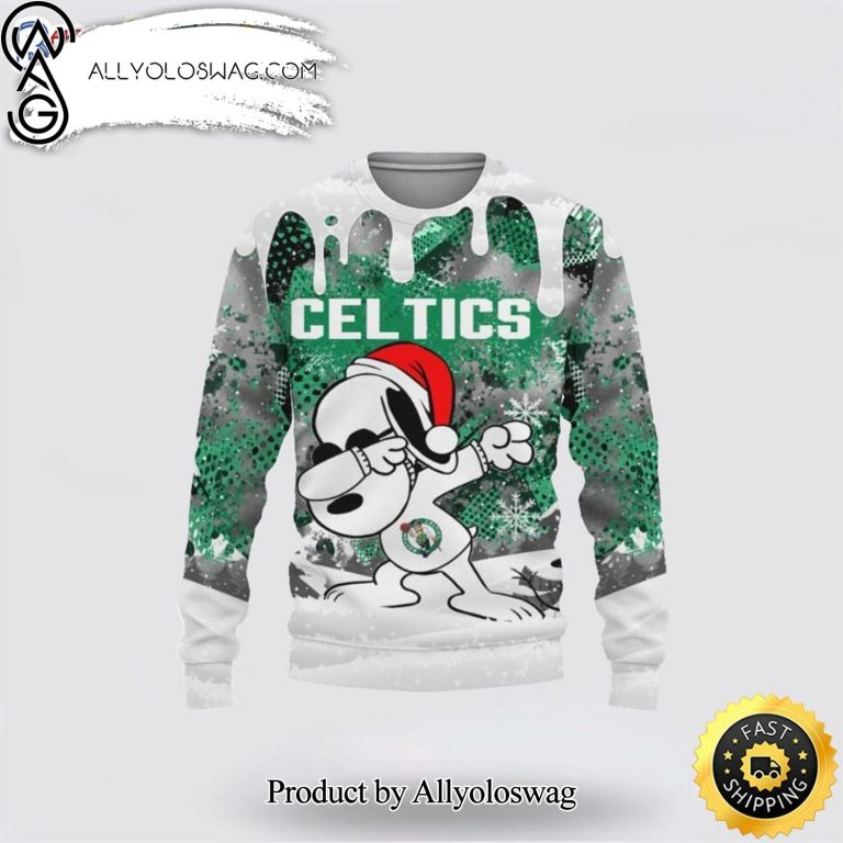 NOTE: [Top-selling] NBA Boston Celtics White Green Snoopy Dabbing The Peanuts Ugly Christmas Wool Knitted Sweater